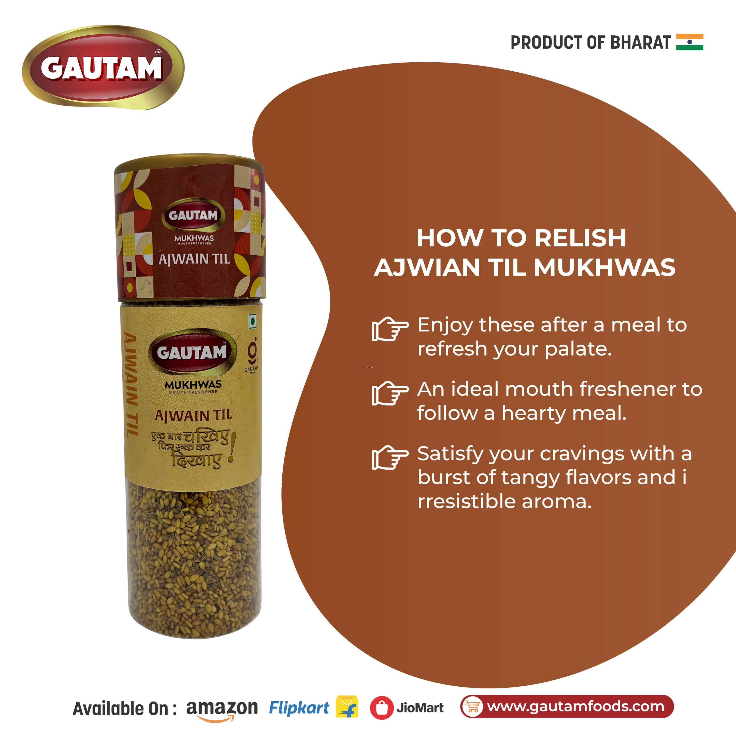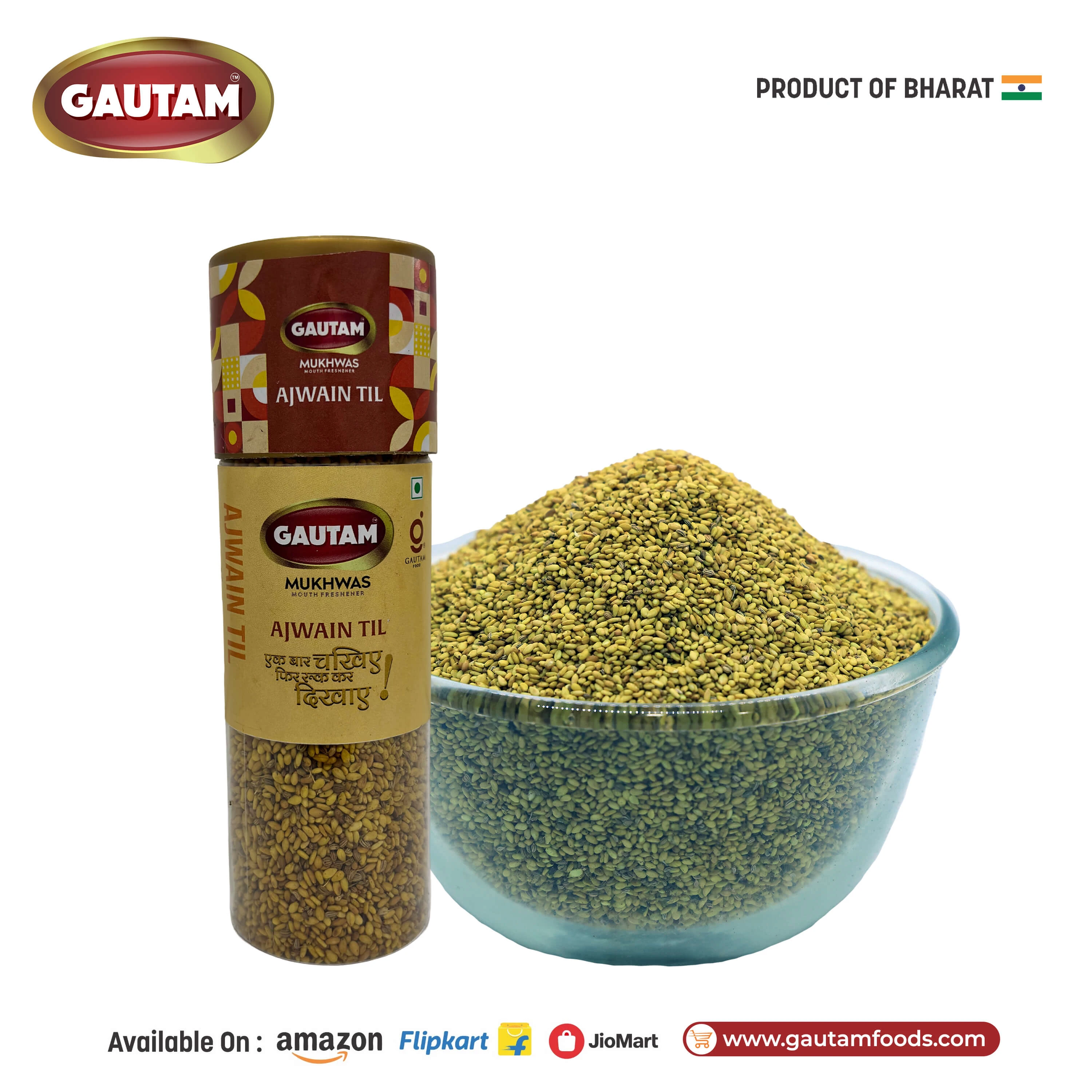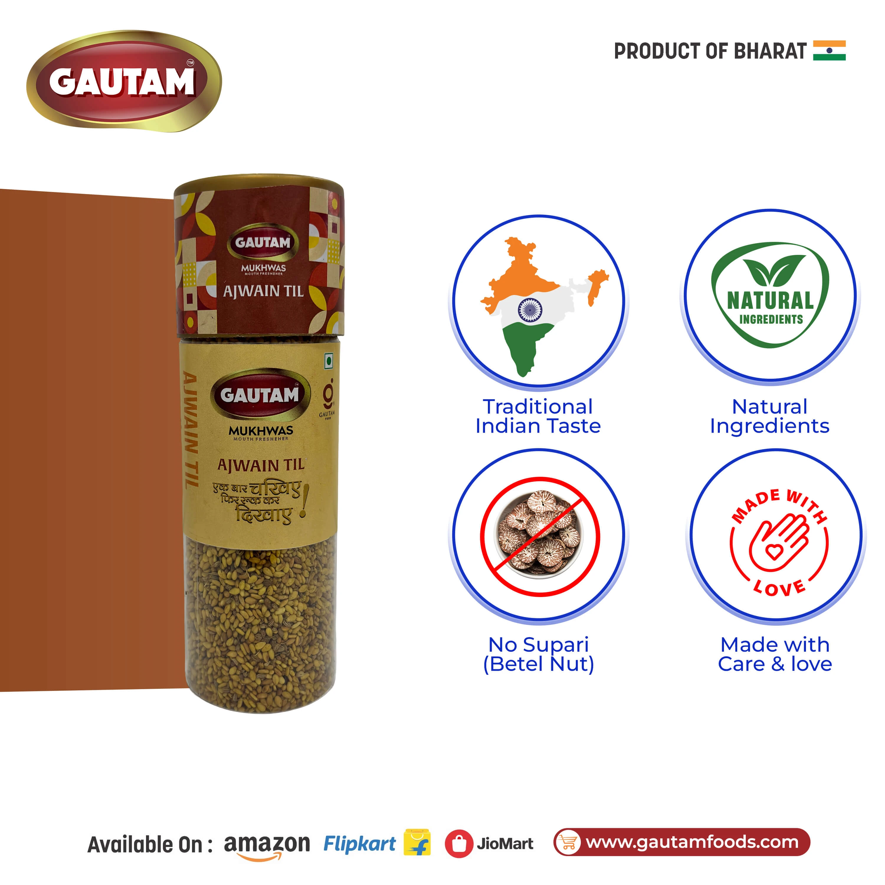 Ajwain Til Mukhwas by Gautam Foods is your perfect choice! Made with the finest natural ingredients – Ajwain Seeds, Sesame Seeds, Iodised Salt, Lemon, and Turmeric Powder, this traditional Indian mouth freshener not only adds a flavorful zest to your palate but also helps in improving digestion naturally.