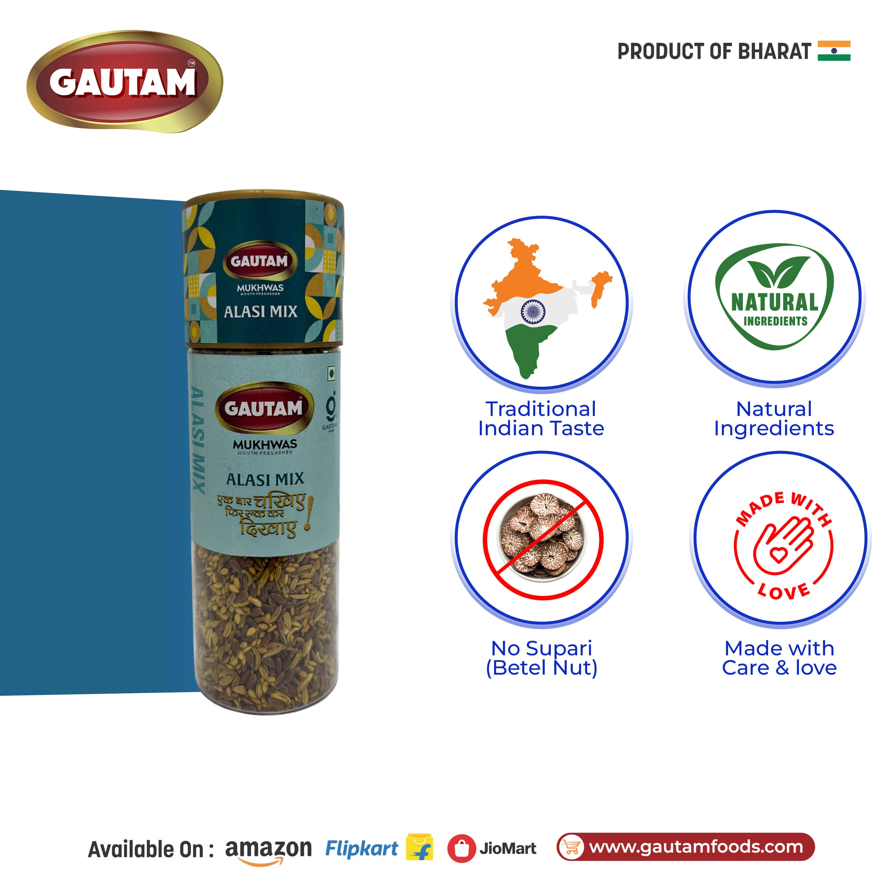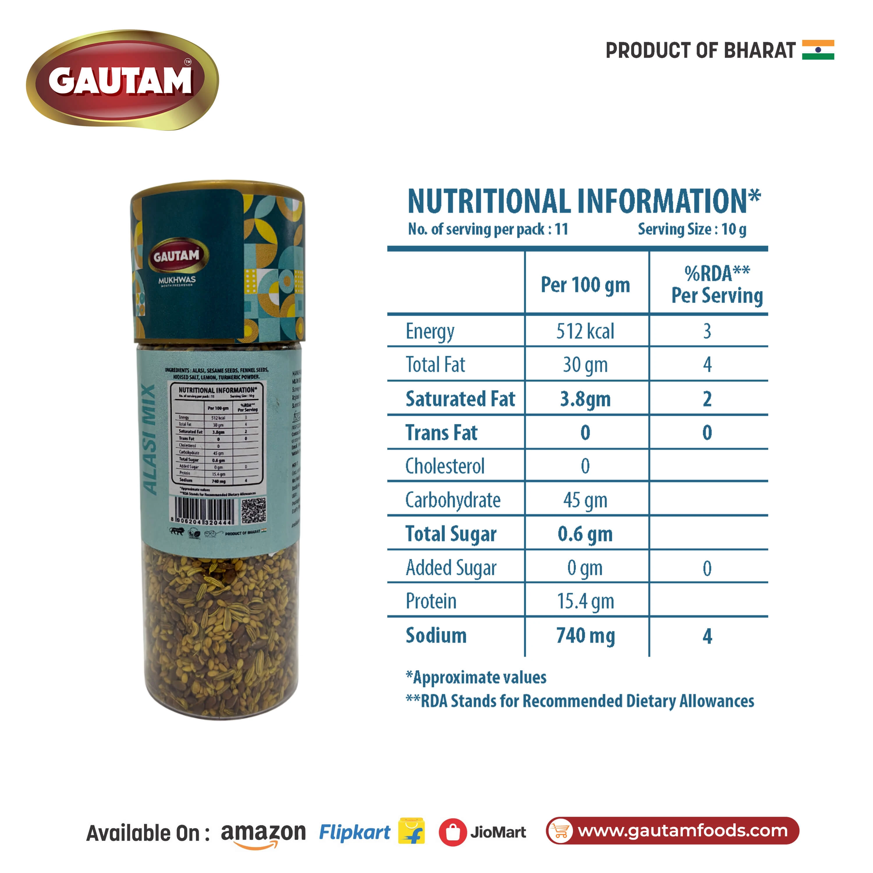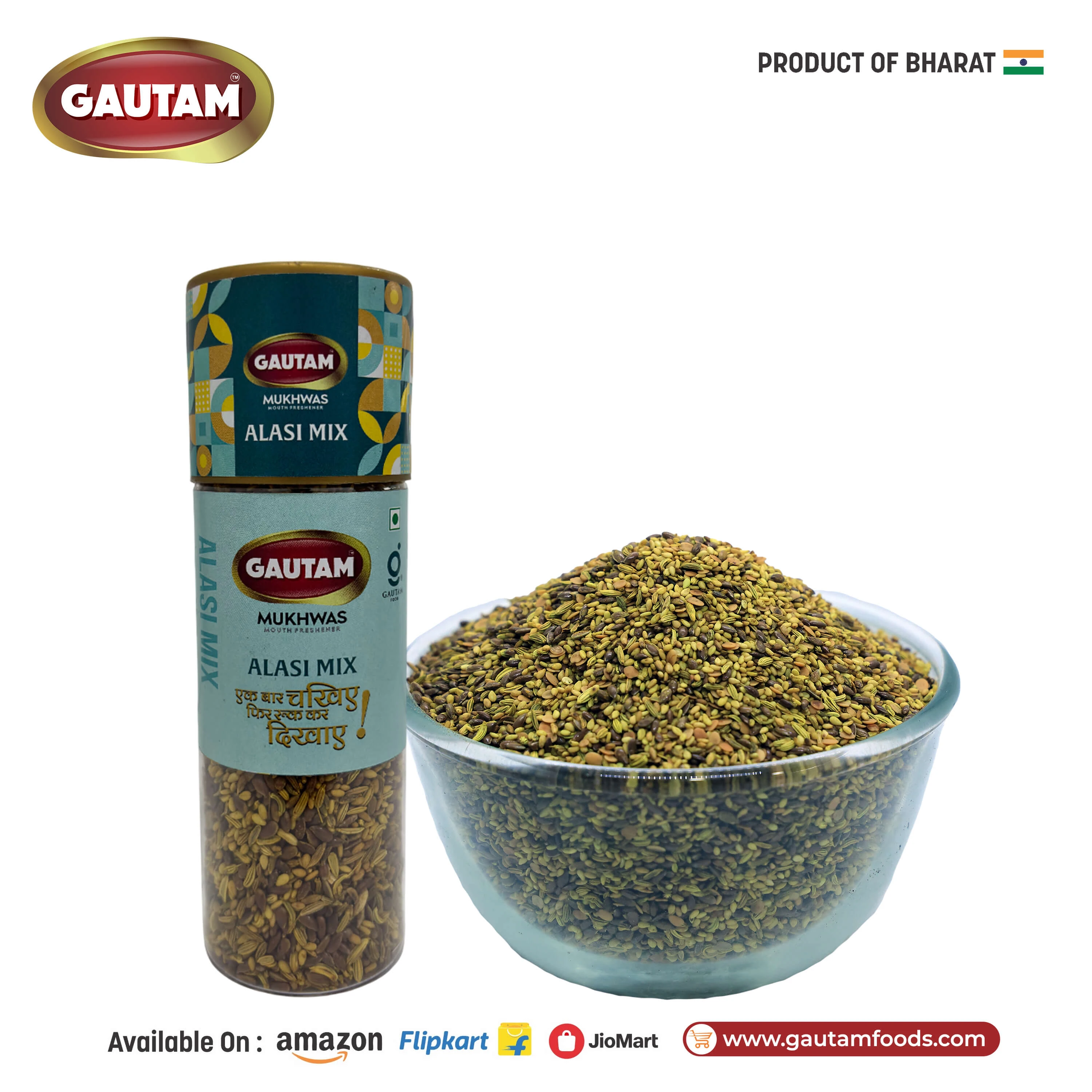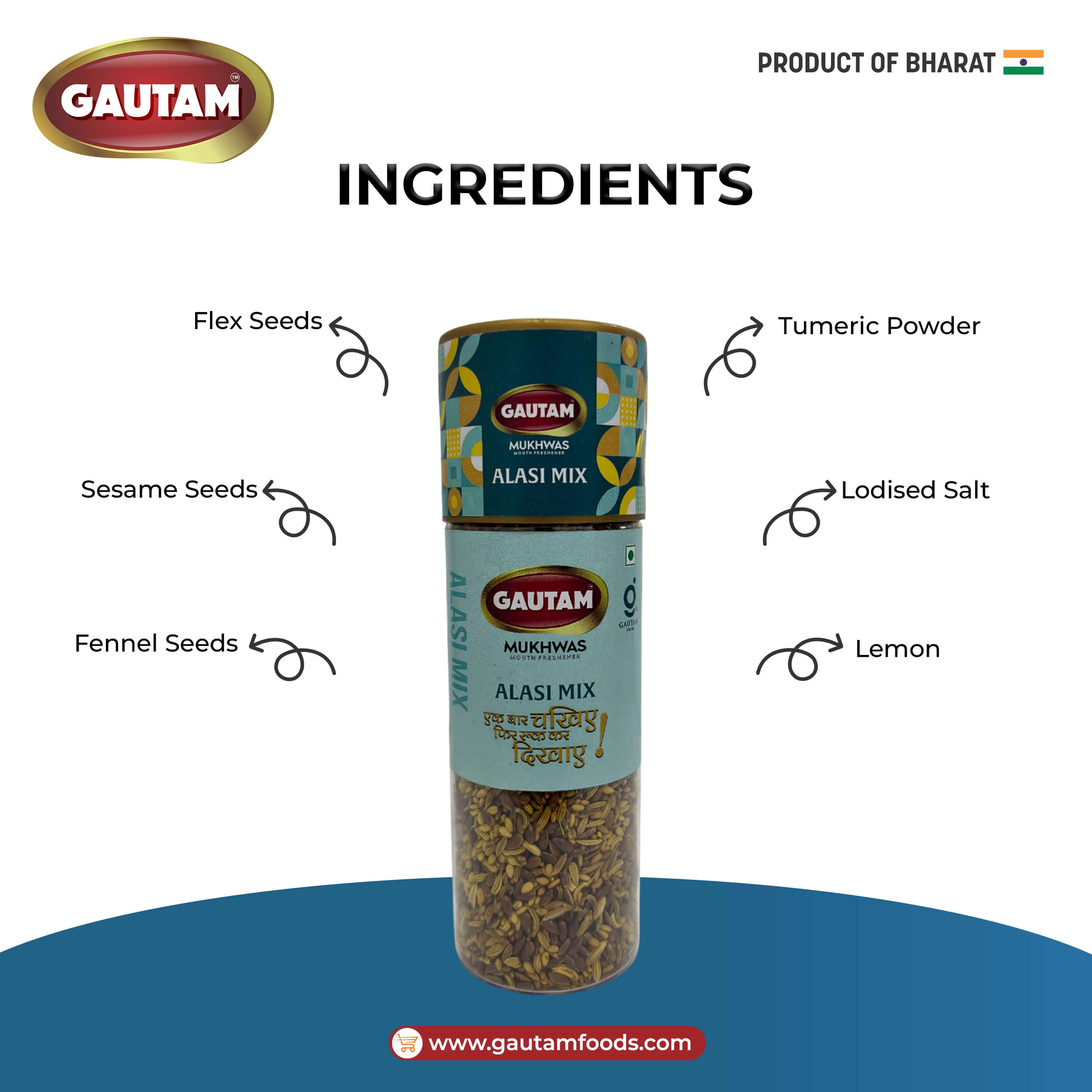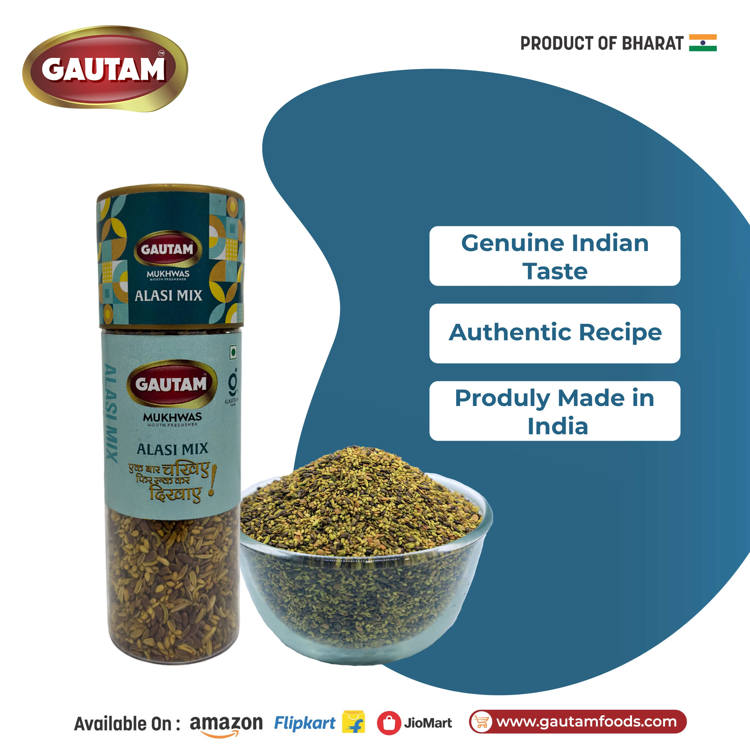 Discover the perfect blend of taste and health with Alsi Mix Mukhwas by Gautam Foods – a traditional Indian mouth freshener crafted with natural, high-quality ingredients. Made from Alsi (Flax Seeds), Sesame Seeds, Fennel Seeds, Iodised Salt, Lemon, and Turmeric Powder, this Mukhwas not only freshens your breath but also supports healthy digestion.