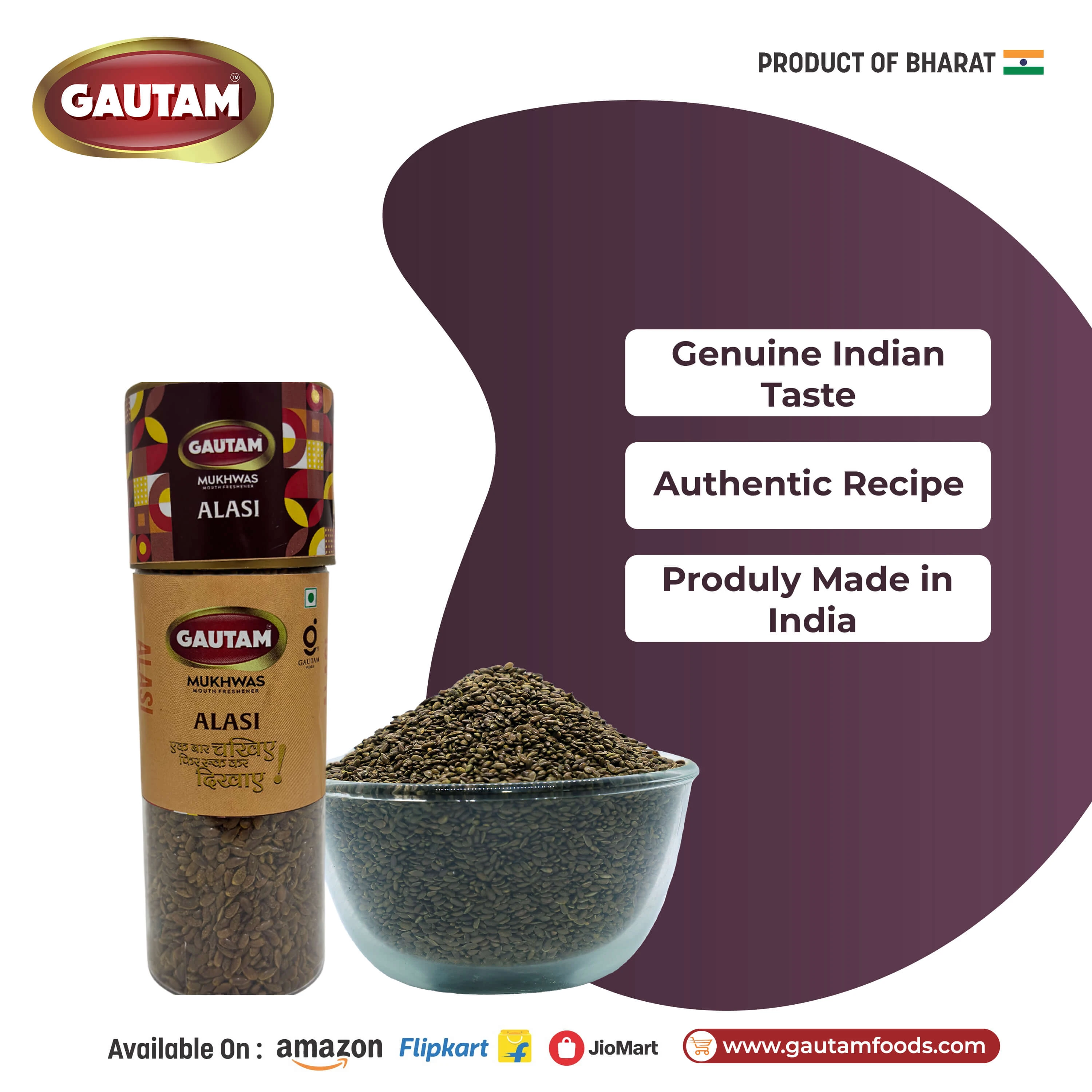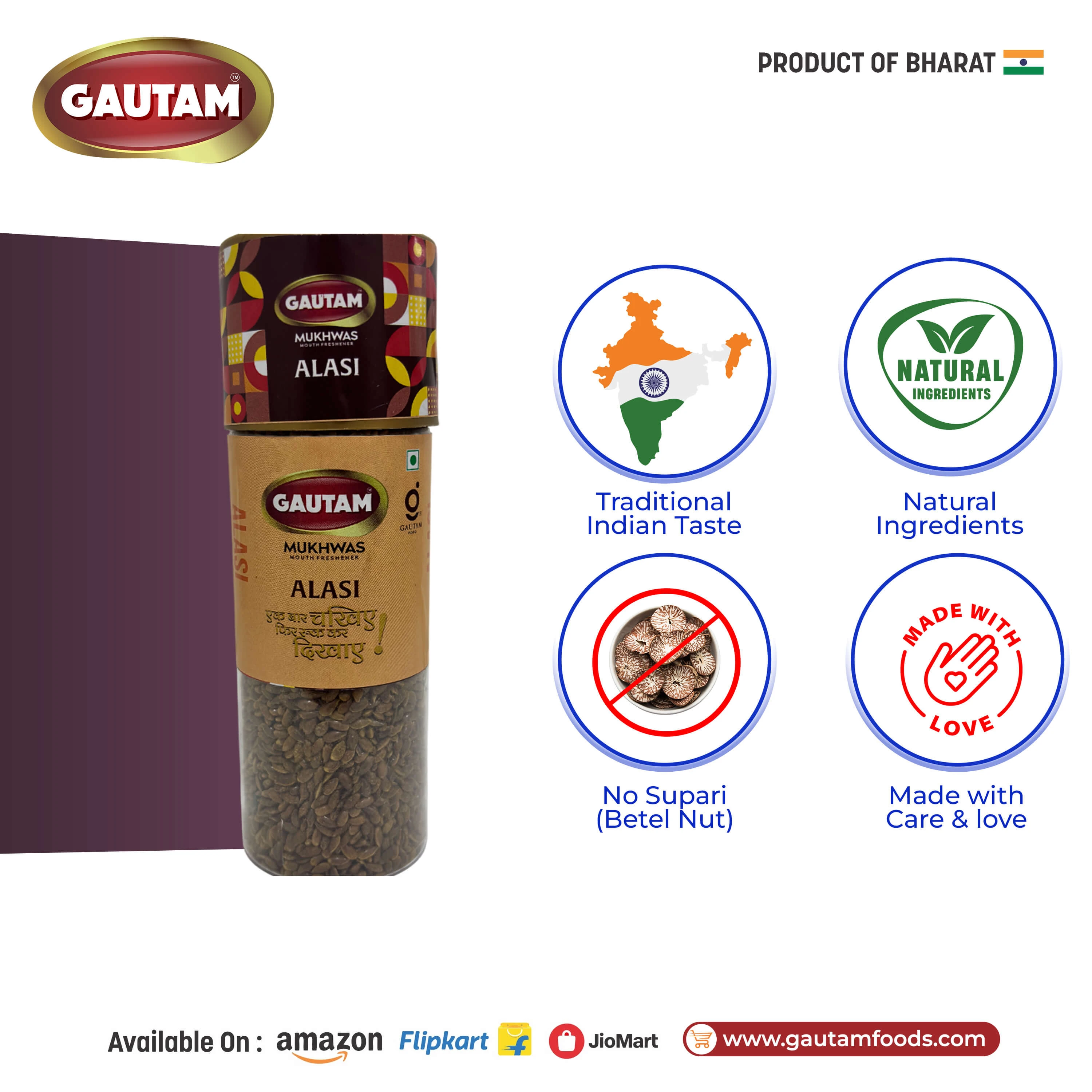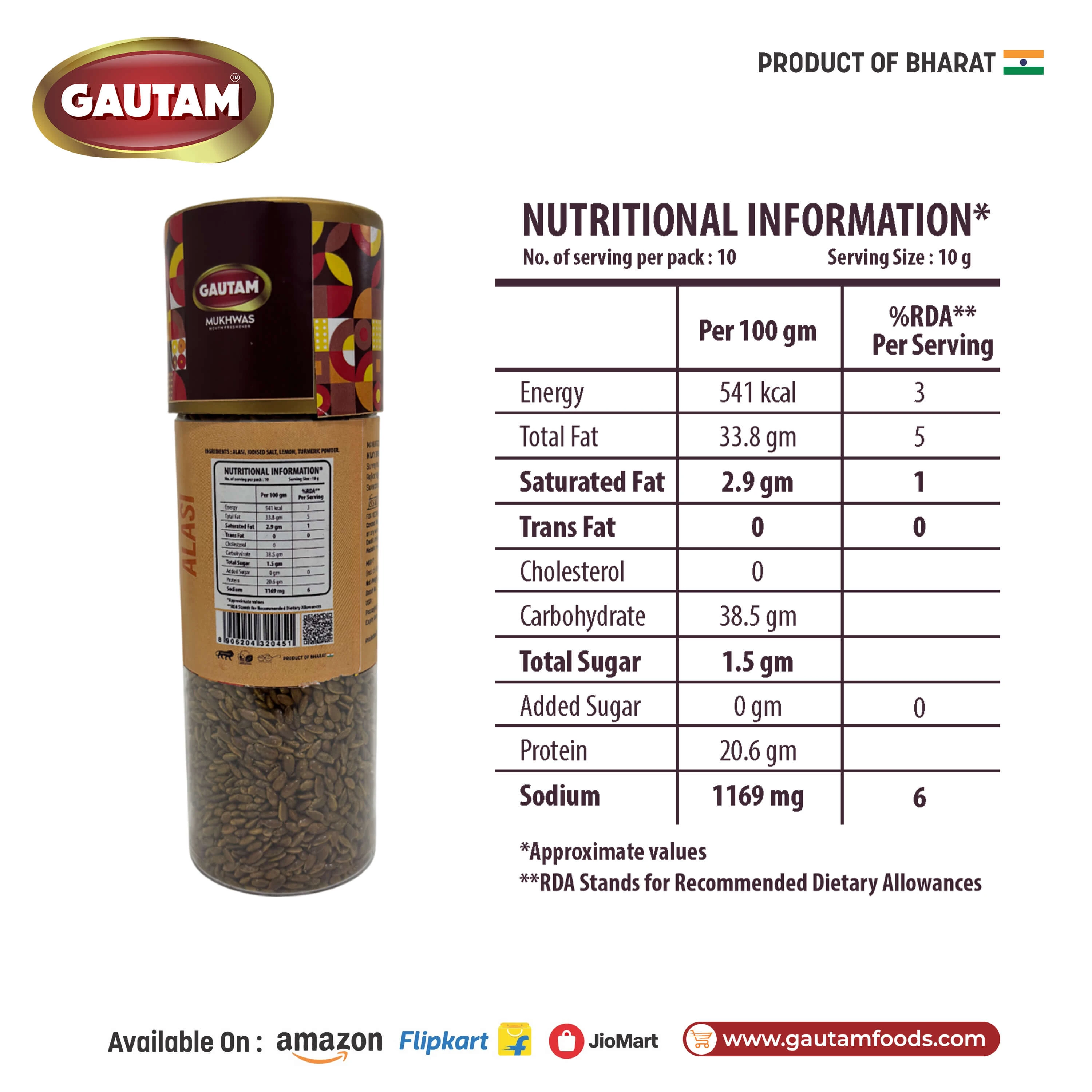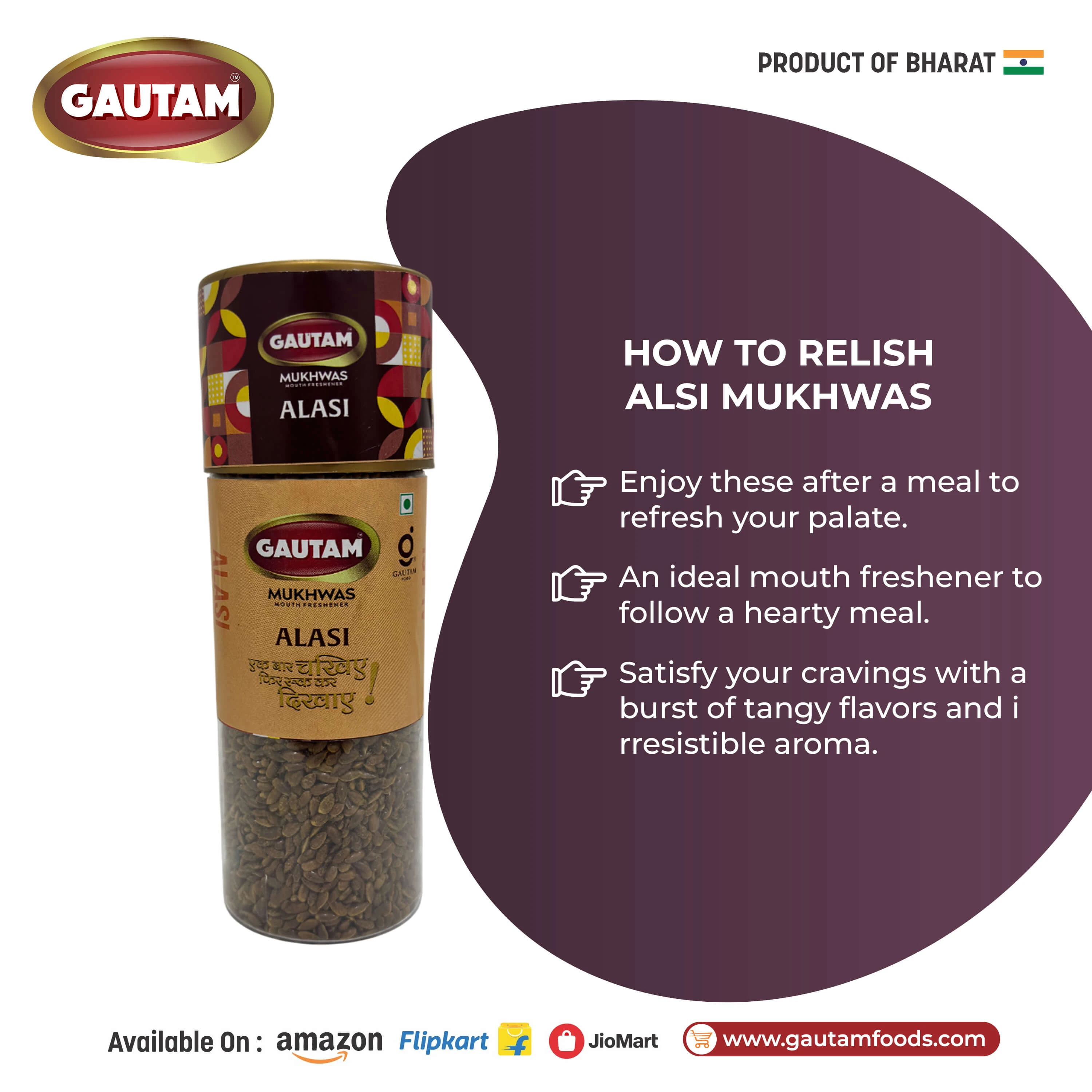 Enjoy the authentic taste and health benefits of Alsi Mukhwas by Gautam Foods – a traditional Indian mouth freshener made from high-quality, natural ingredients. Crafted with Alsi (Flax Seeds), Iodised Salt, Lemon, and Turmeric Powder, this Mukhwas helps freshen your breath and supports digestion naturally.