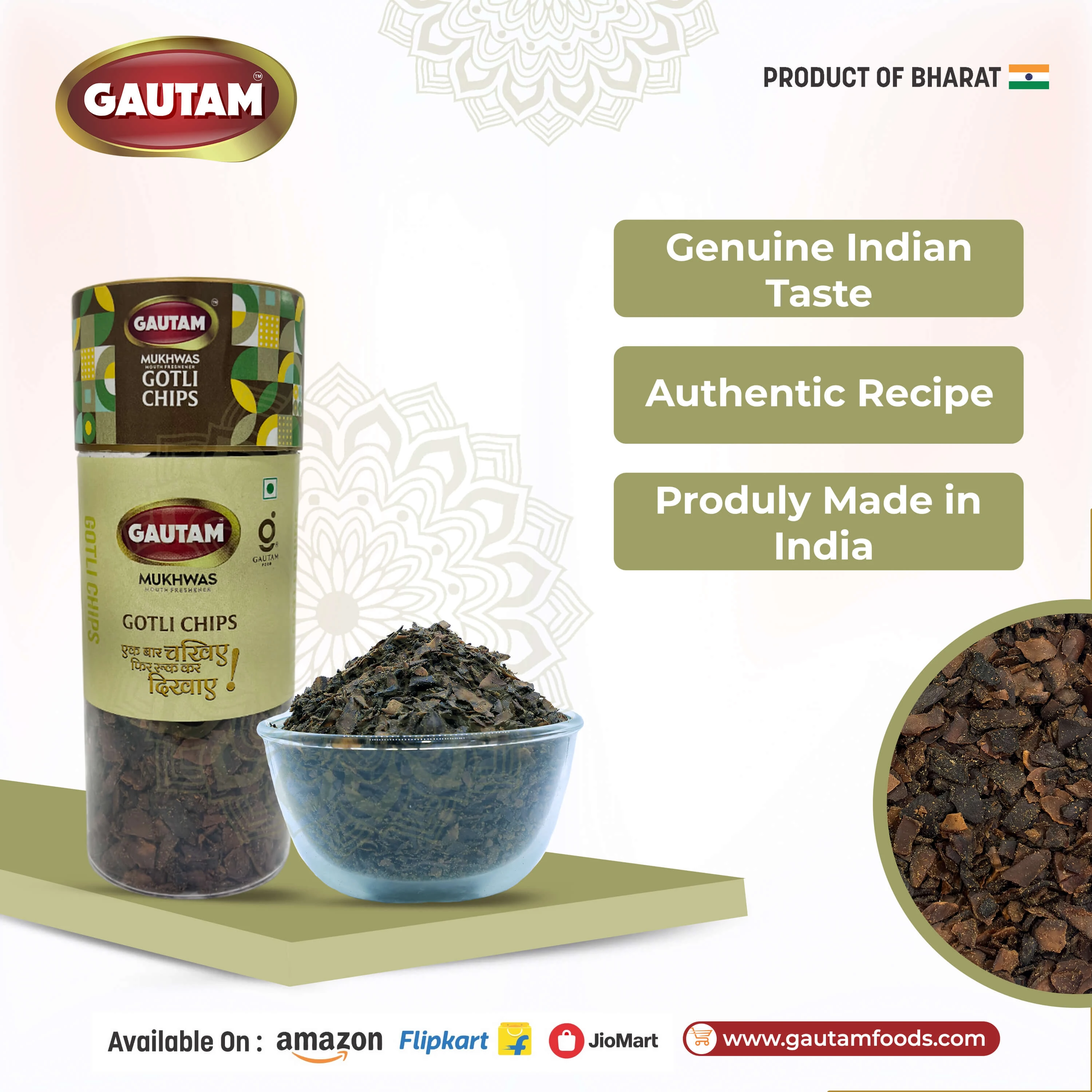 Enjoy Gautam Gotli Chips after meals or anytime you want a flavorful and crunchy mouth freshener.