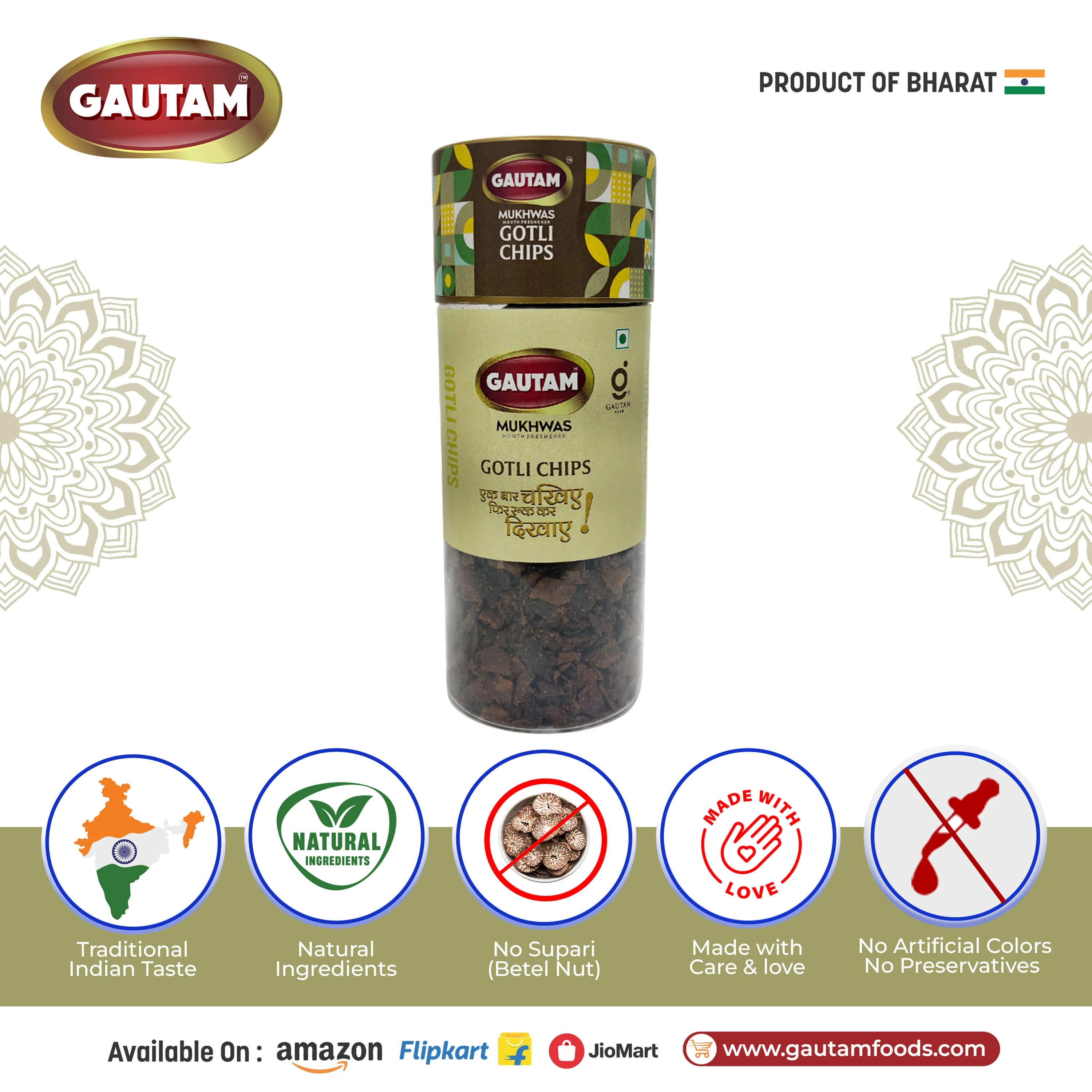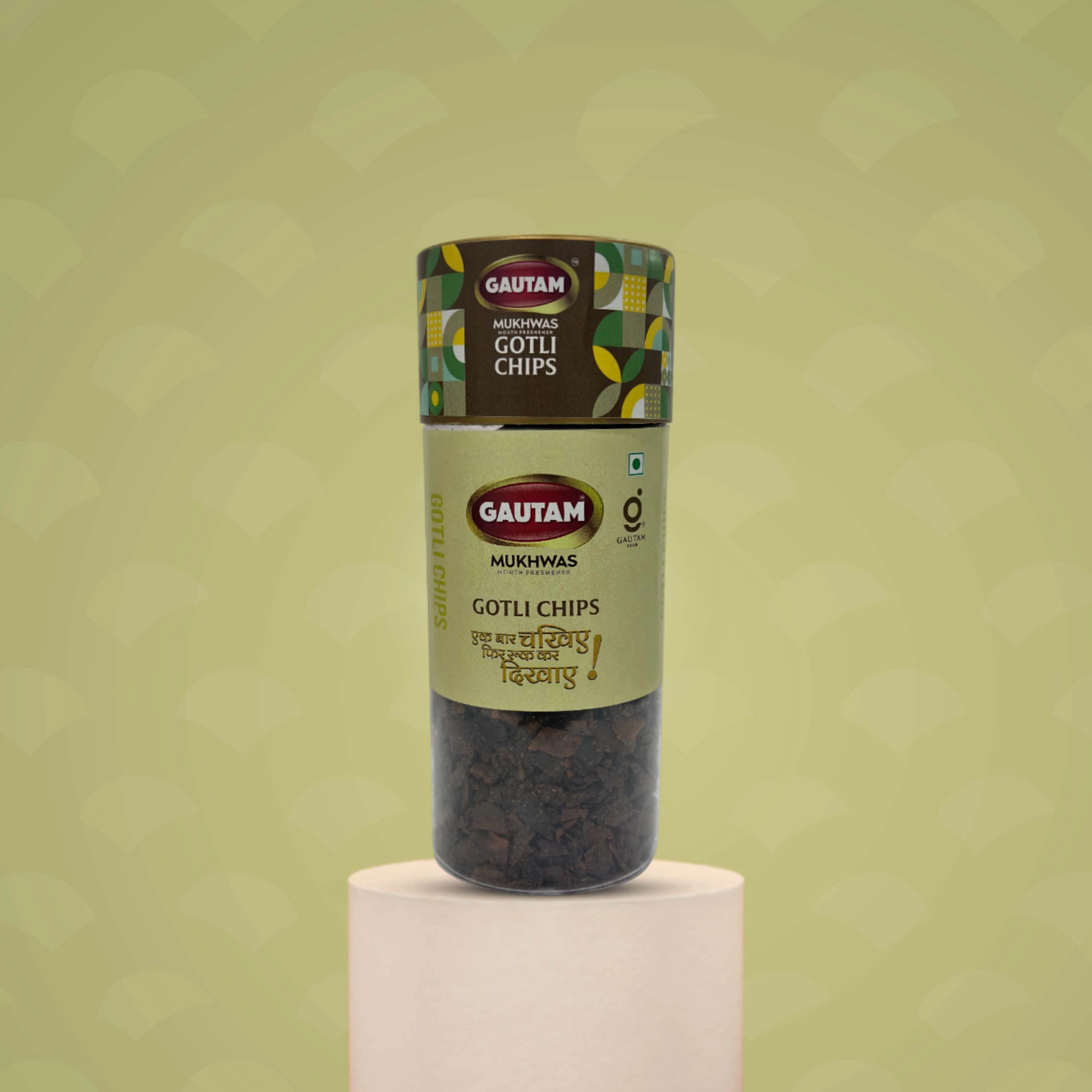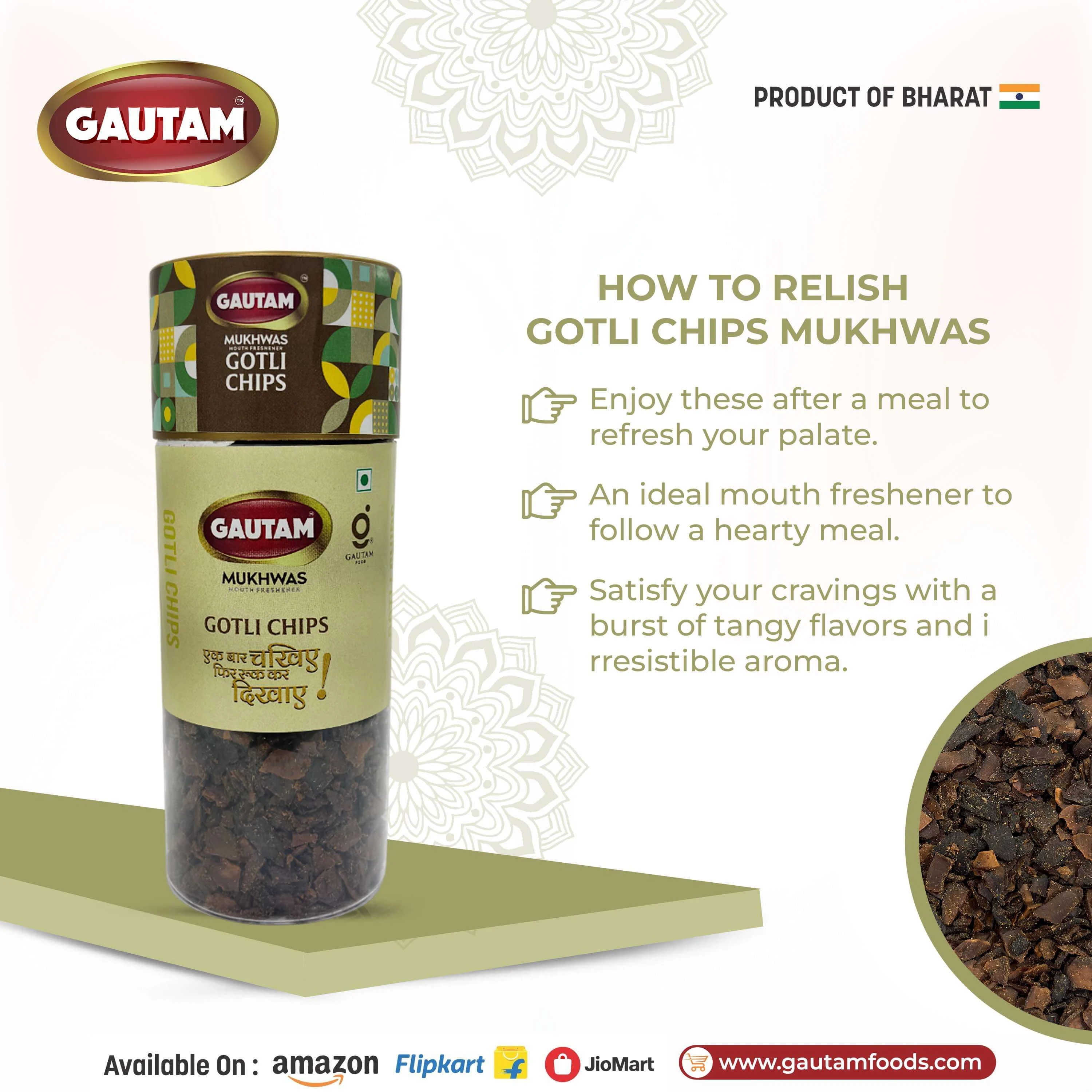 Gautam Gotli Chips is a unique and traditional Indian mouth freshener made from mango seeds (gotli) blended with flavorful spices. Known for its crunchy texture and spicy taste, this mukhwas offers a distinctive after-meal experience loved in many parts of India.