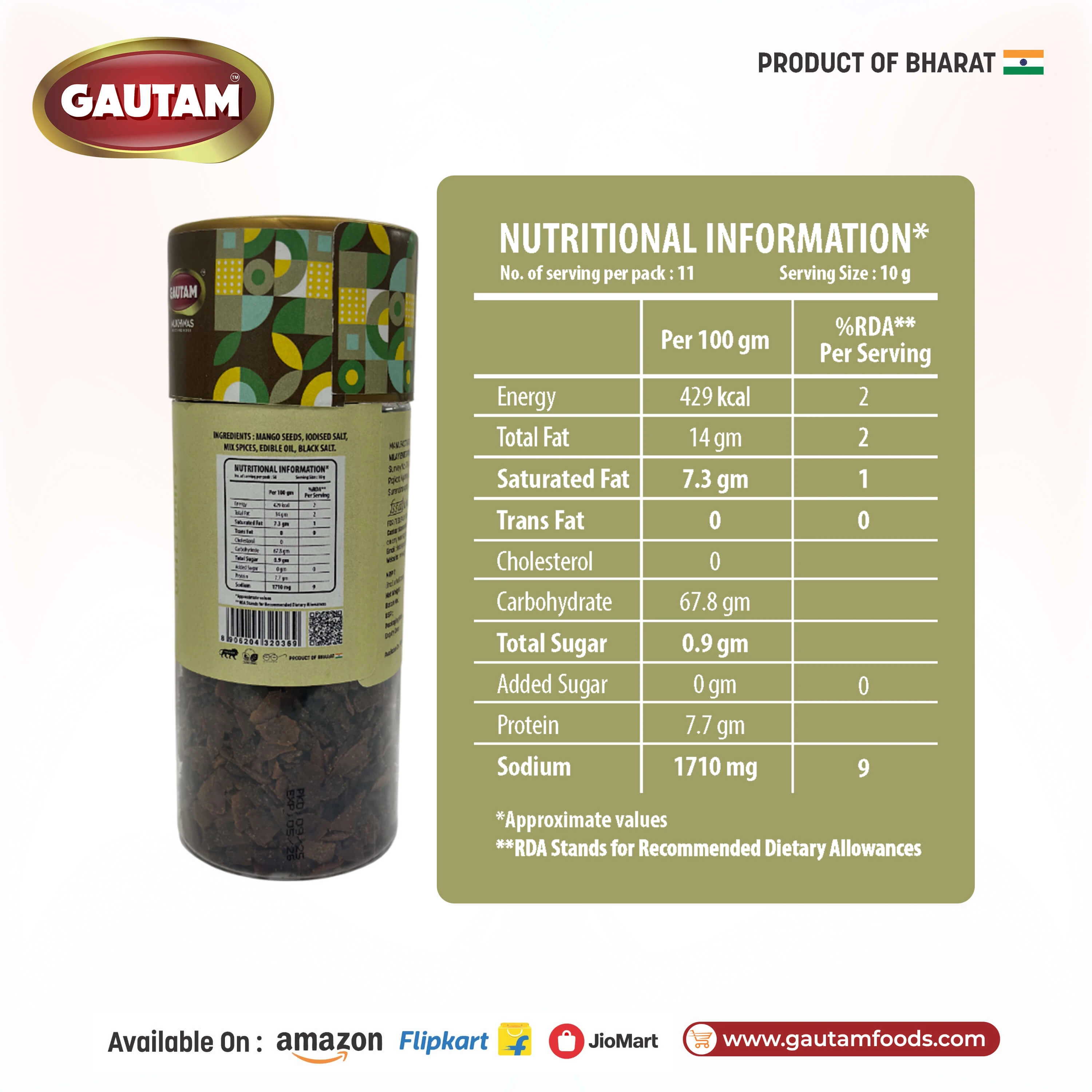 Made from mango seeds, offering a distinctive and authentic Indian flavor.