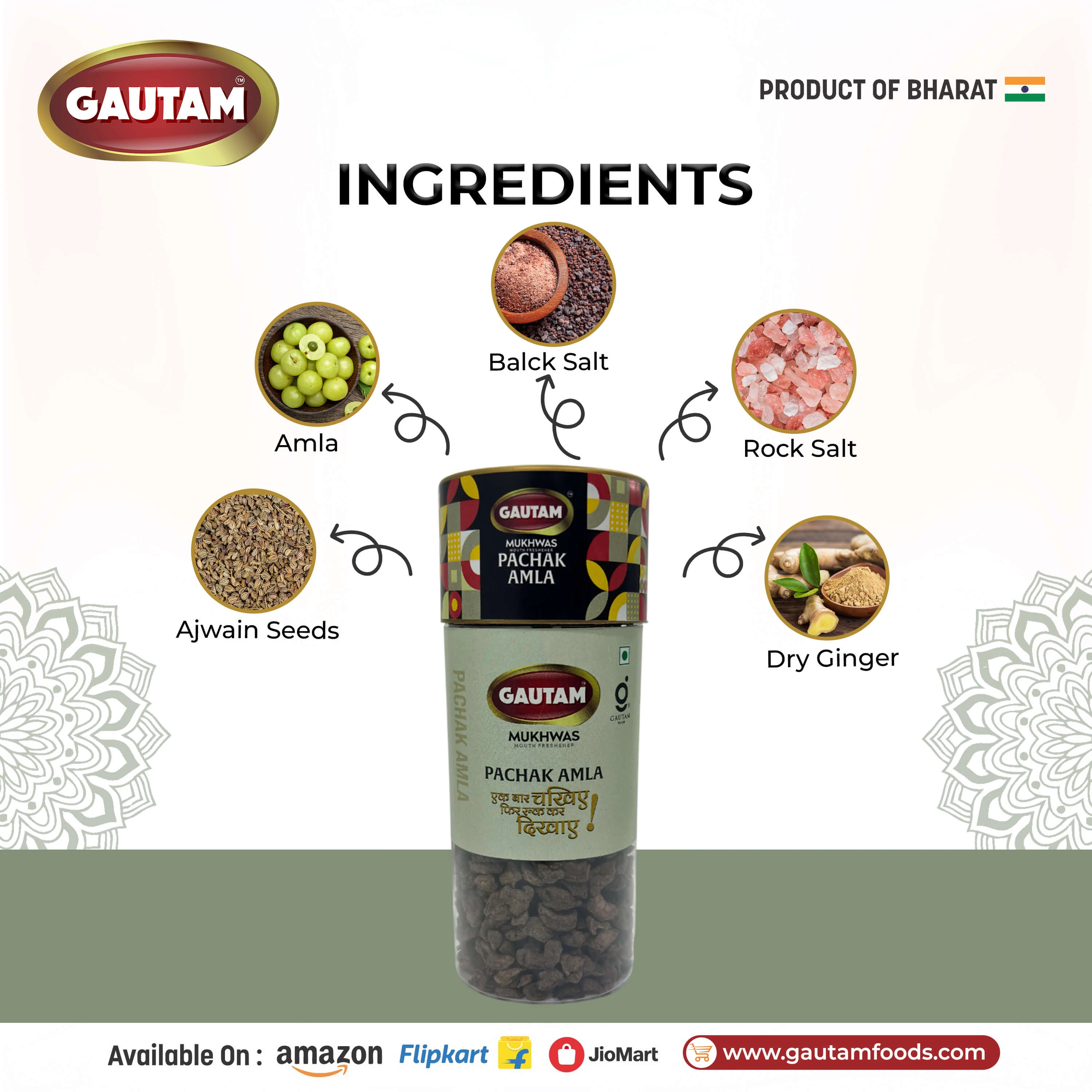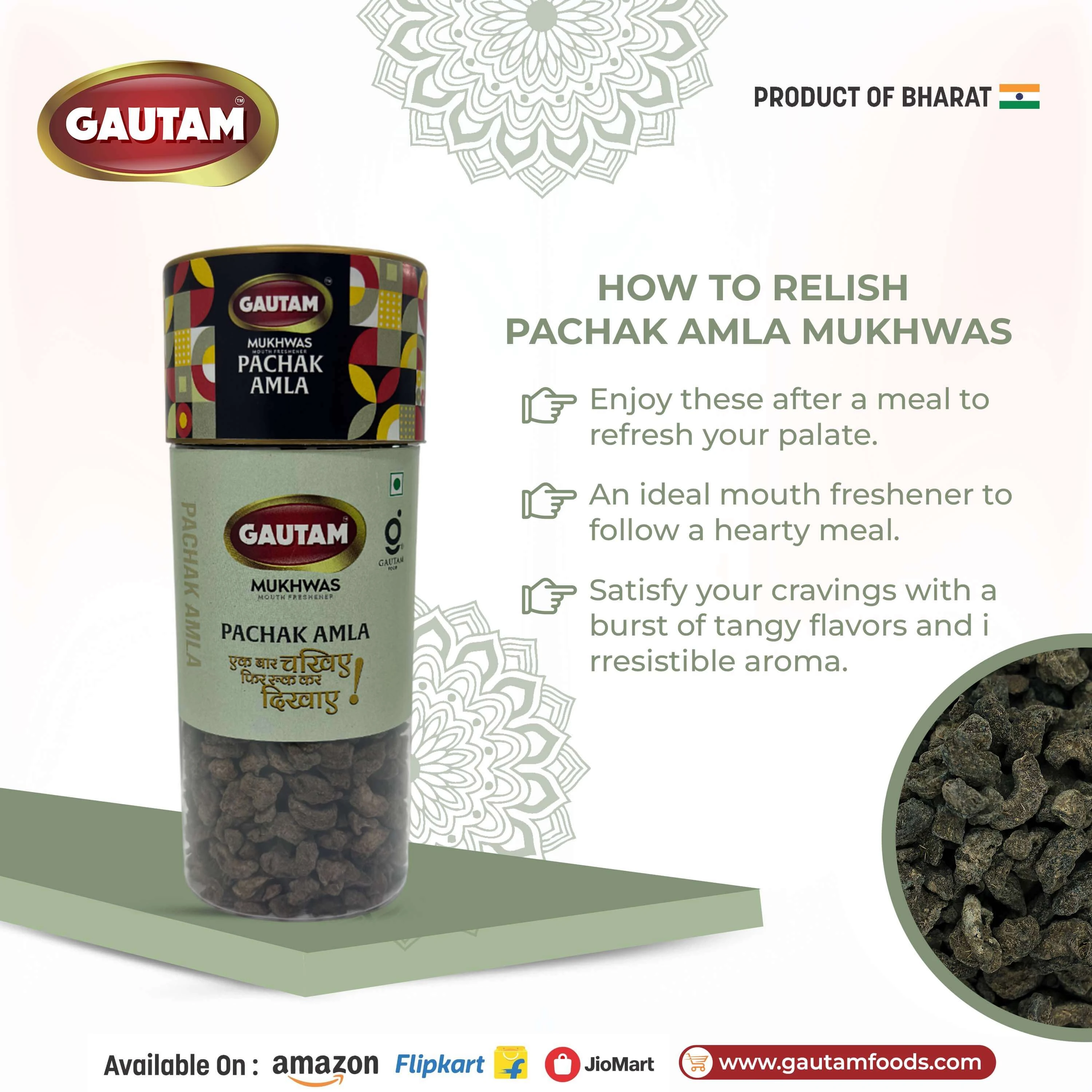 Gautam Pachak Amla is a flavorful and effective digestive made from premium Indian gooseberry (Amla) blended with traditional Indian spices like ajwain, dry ginger, and natural salts. This unique combination delivers a perfect balance of tangy, salty, and mildly spicy taste, making it an ideal after-meal digestive.