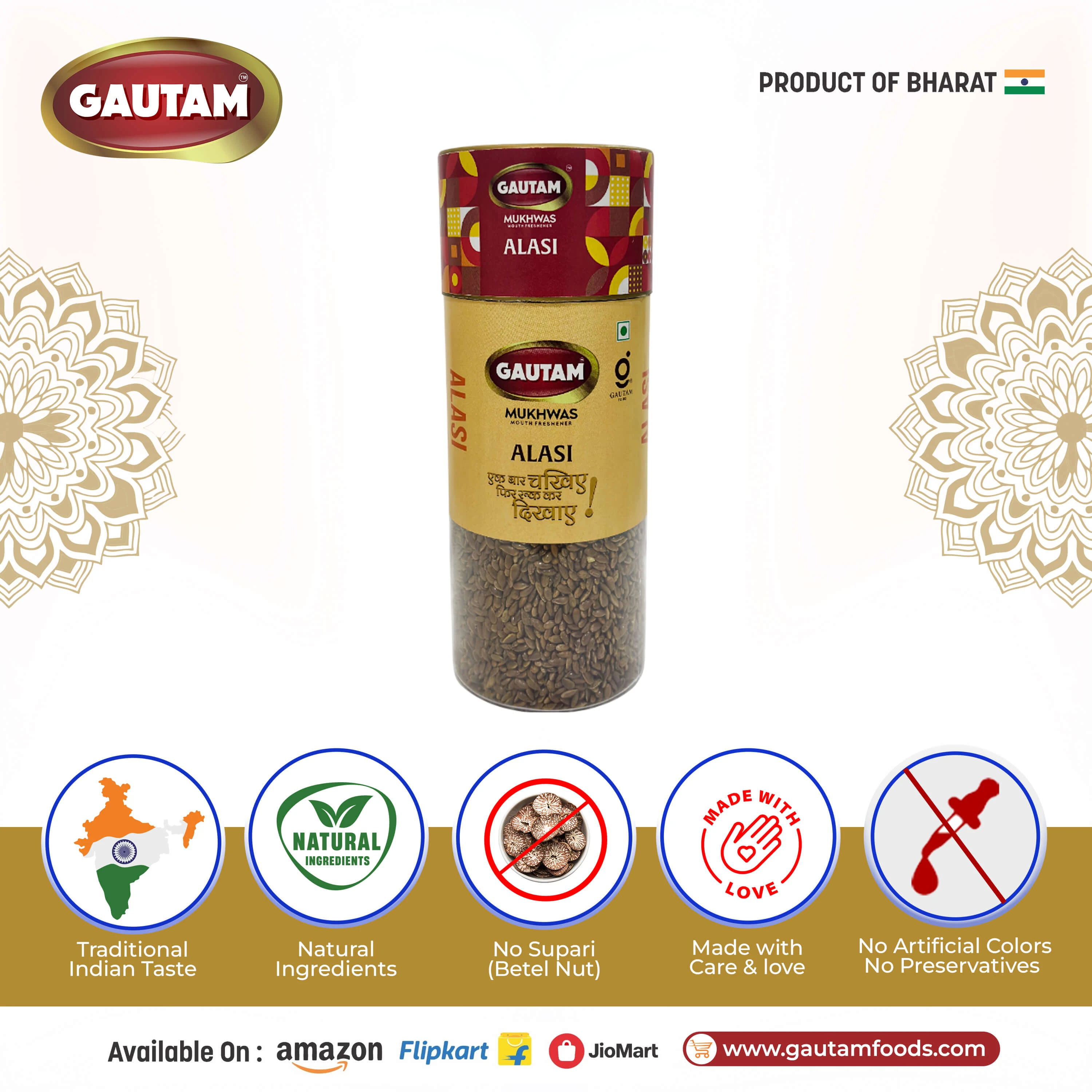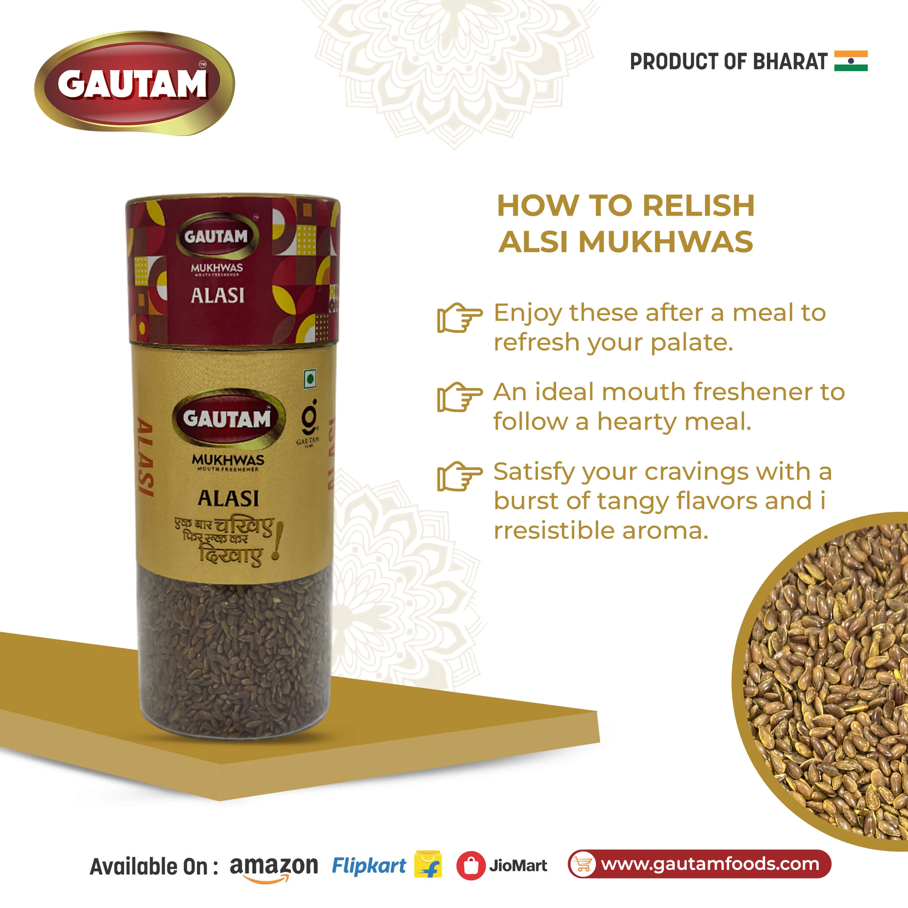 Enjoy Gautam Alsi Mukhwas after meals to experience a natural mouth refreshment along with the goodness of traditional ingredients.