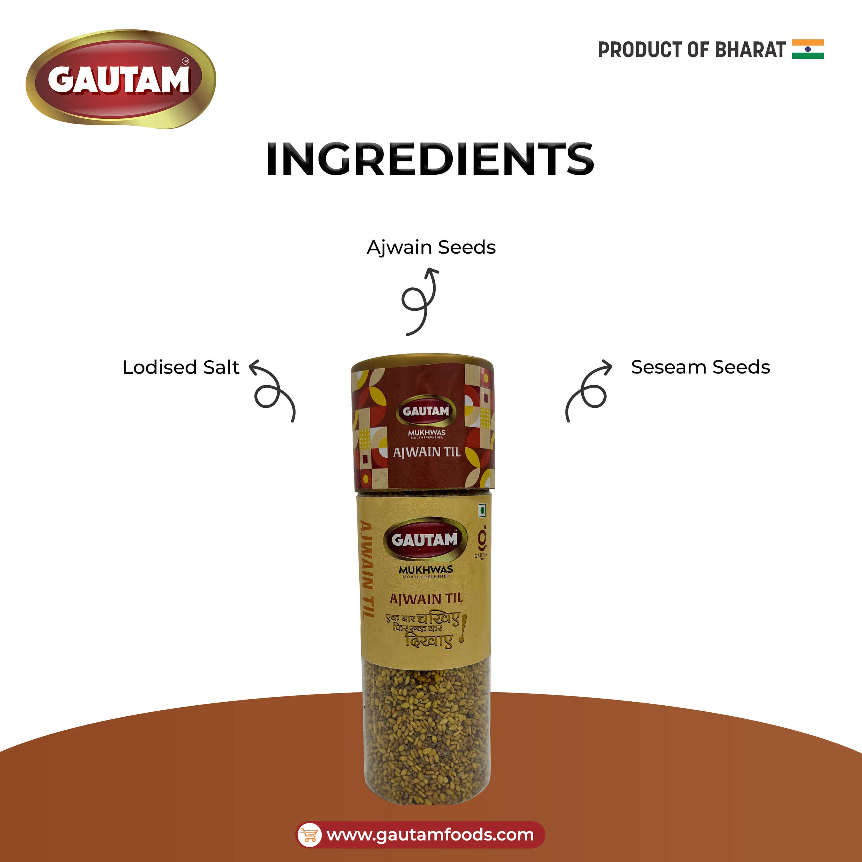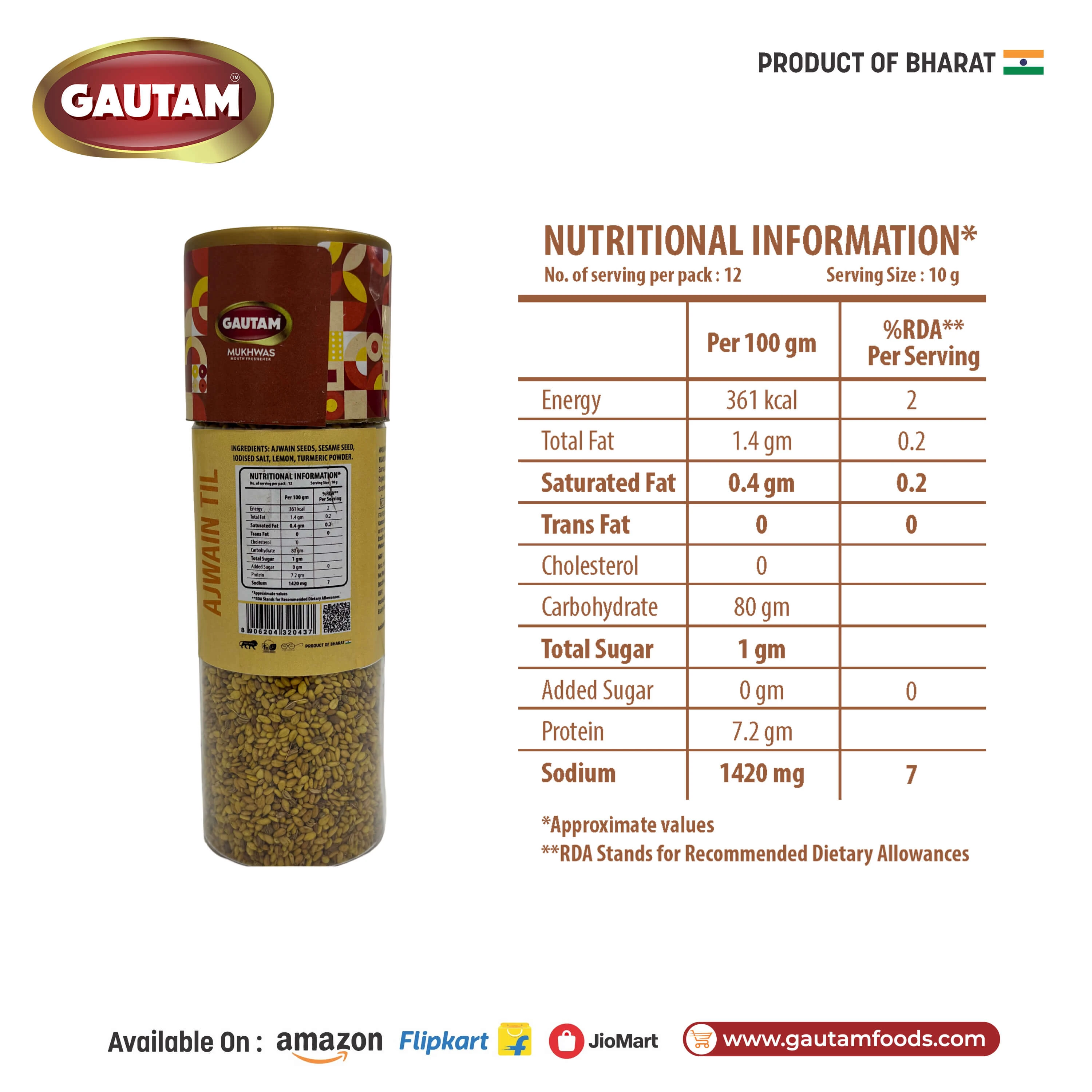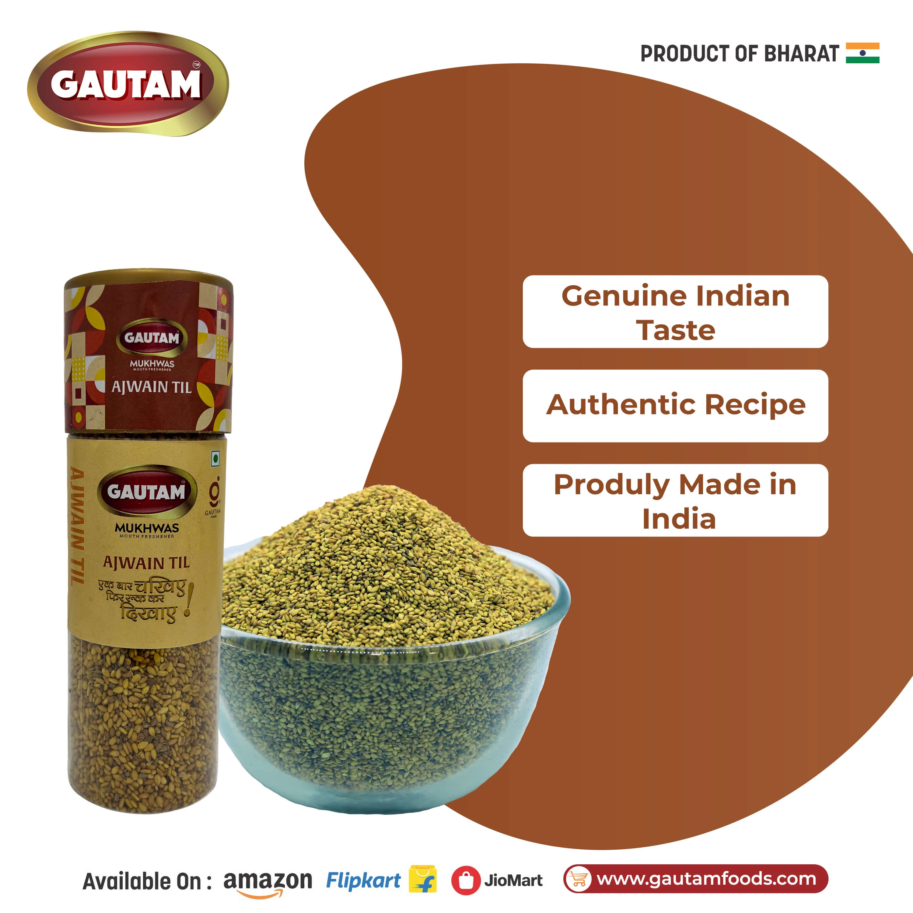 Ajwain Til Mukhwas by Gautam Foods is your perfect choice! Made with the finest natural ingredients – Ajwain Seeds, Sesame Seeds, Iodised Salt, Lemon, and Turmeric Powder, this traditional Indian mouth freshener not only adds a flavorful zest to your palate but also helps in improving digestion naturally.