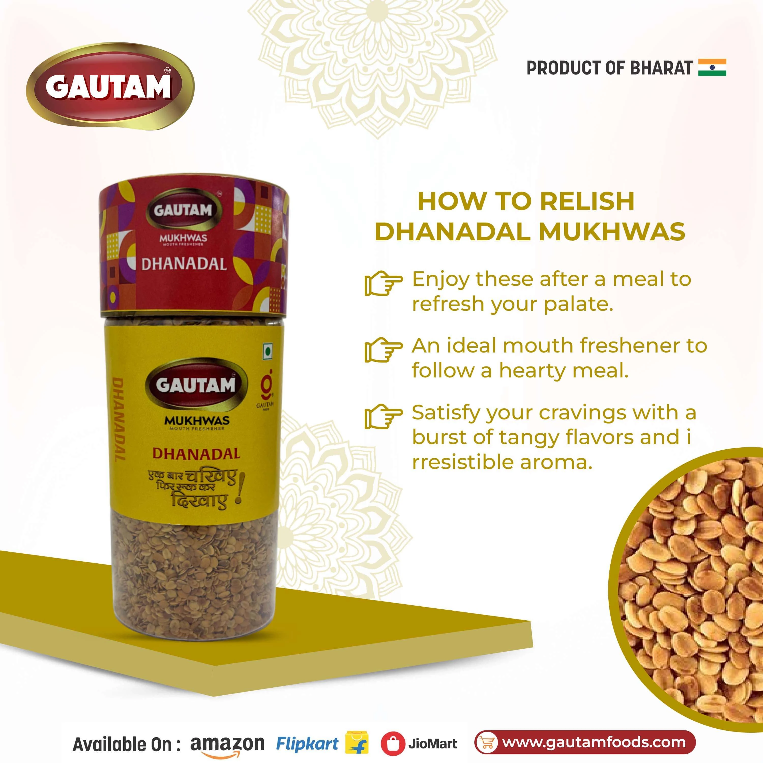 Gautam Dhanadal Mukhwas is a simple yet traditional Indian mouth freshener made from carefully selected premium coriander seeds. Known for its light flavor and digestive properties, Dhanadal is widely enjoyed after meals for refreshing breath and supporting digestion.