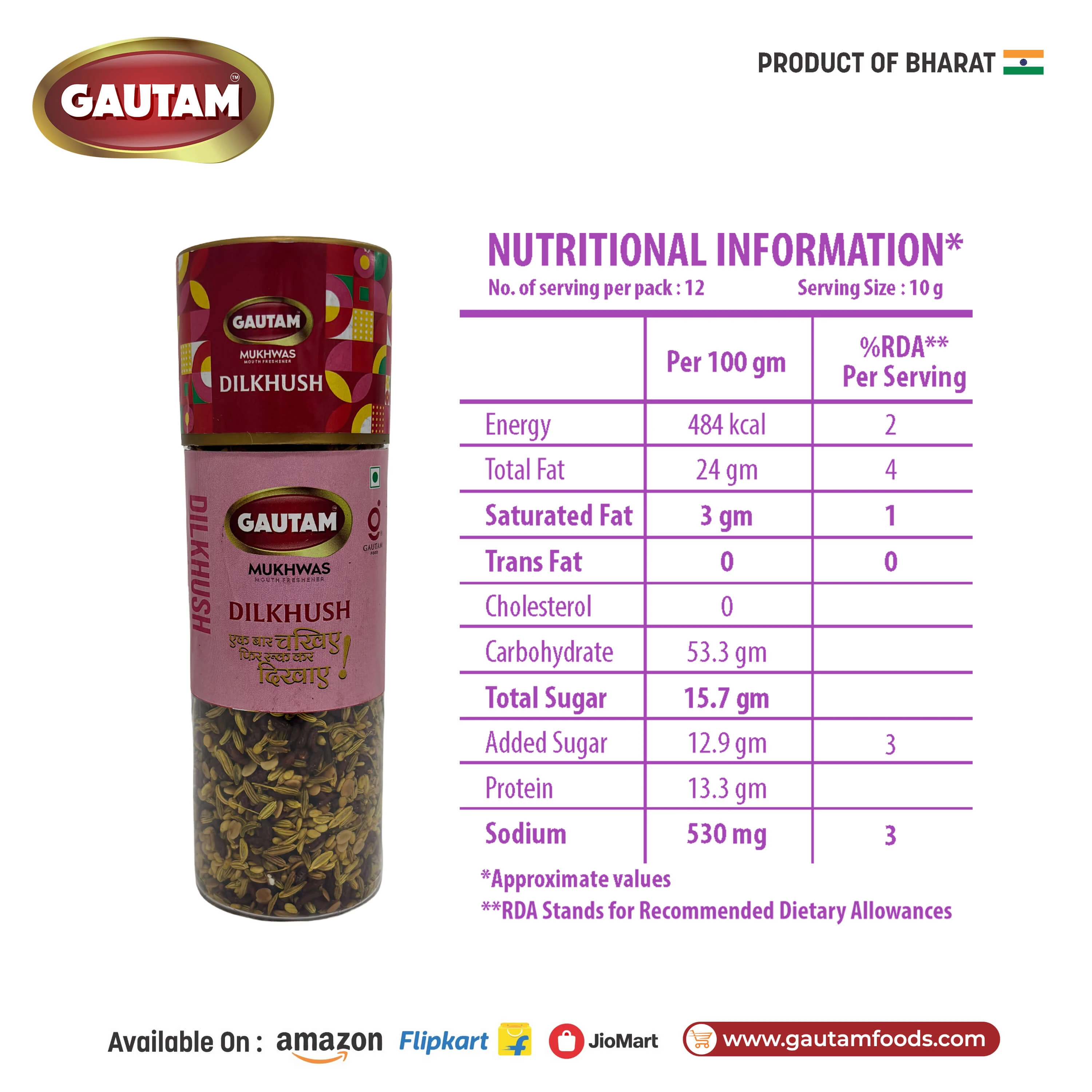 Indulge in the delightful taste of Dilkhush Mukhwas by Gautam Foods – a traditional Indian mouth freshener crafted to refresh your breath and support digestion naturally. Made with premium ingredients like Coriander Seeds, Sesame Seeds, Fennel Seeds, Sugar, Menthol, and Iodised Salt, this Mukhwas combines sweetness, aroma, and a refreshing burst of flavor in every bite.