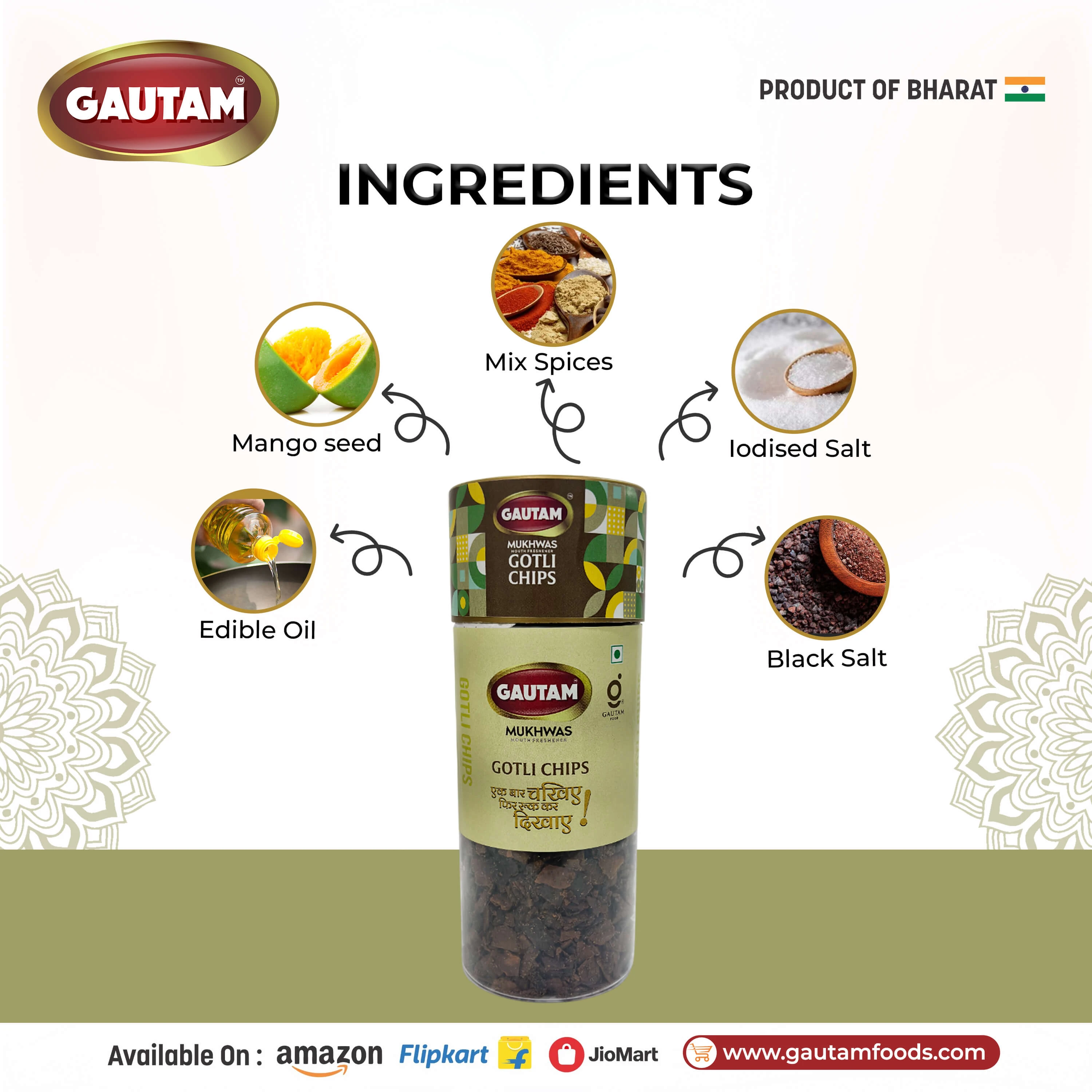 Gautam Gotli Chips is a unique and traditional Indian mouth freshener made from mango seeds (gotli) blended with flavorful spices. Known for its crunchy texture and spicy taste, this mukhwas offers a distinctive after-meal experience loved in many parts of India.