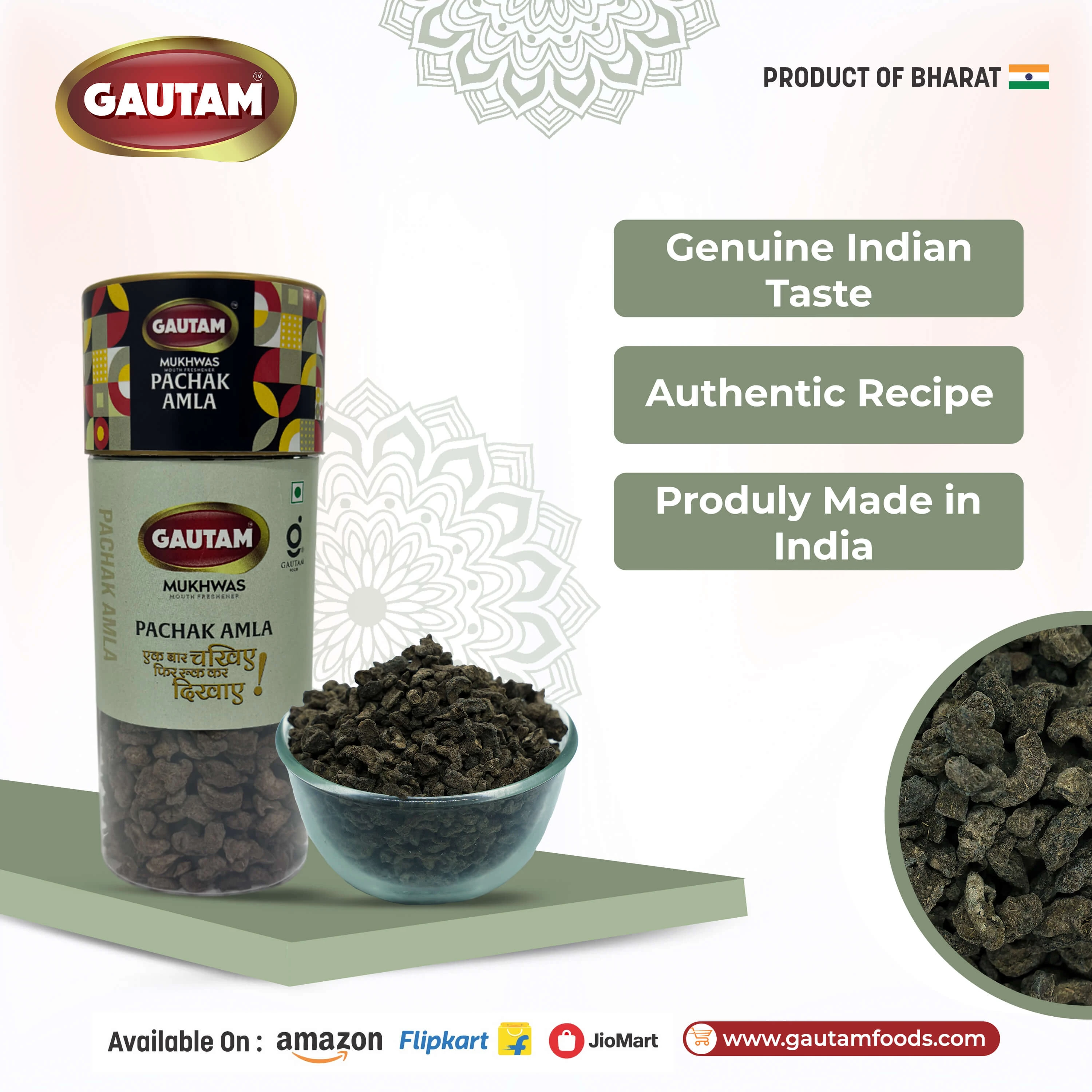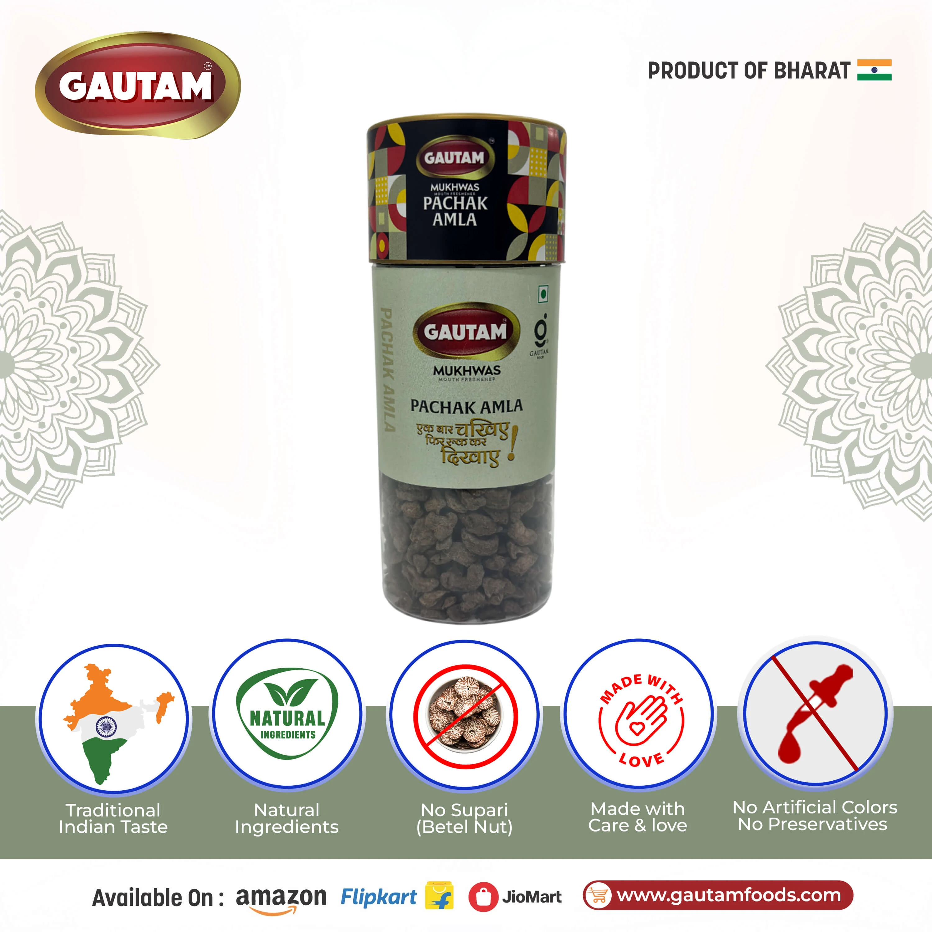 Gautam Pachak Amla is a flavorful and effective digestive made from premium Indian gooseberry (Amla) blended with traditional Indian spices like ajwain, dry ginger, and natural salts. This unique combination delivers a perfect balance of tangy, salty, and mildly spicy taste, making it an ideal after-meal digestive.