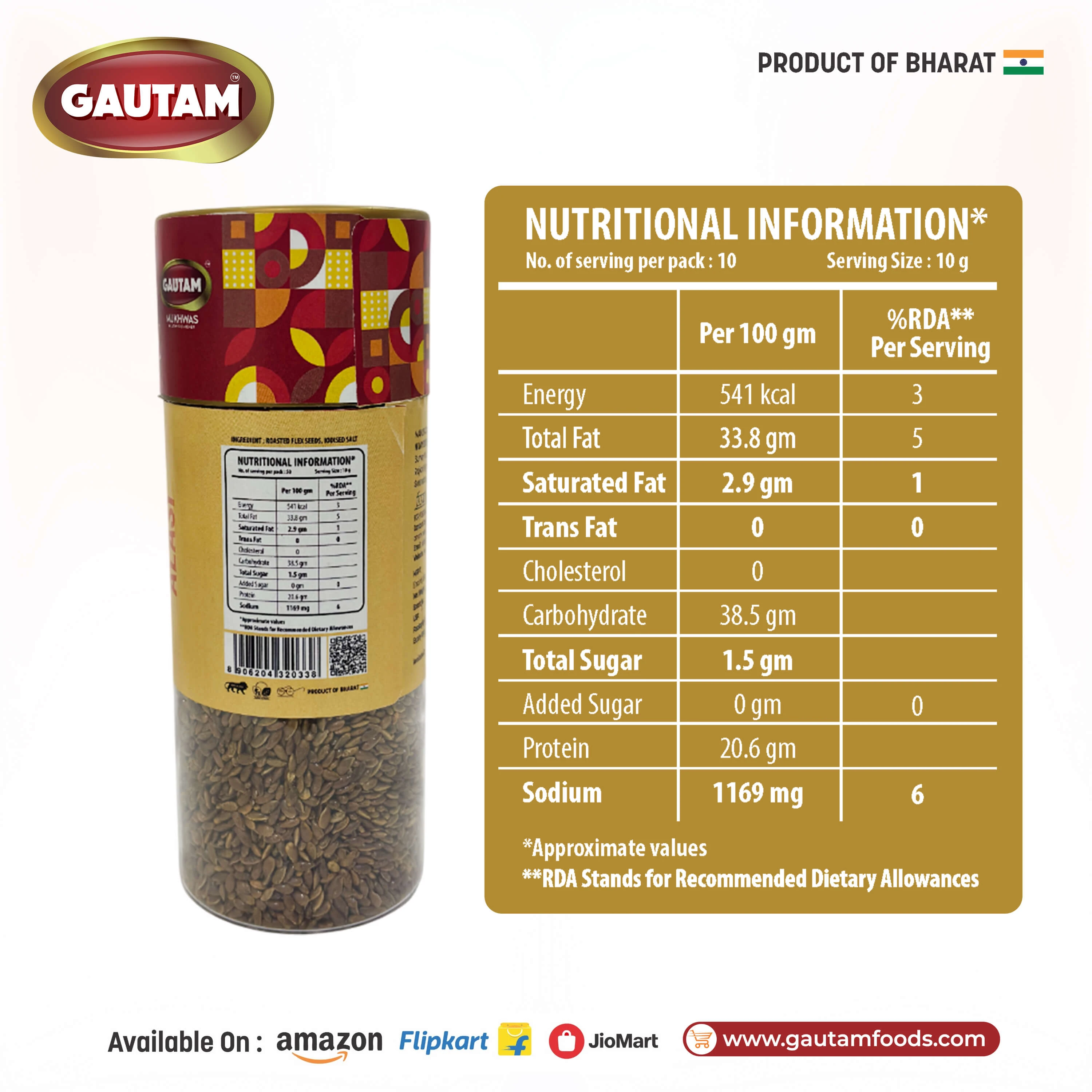 Gautam Roasted Alsi Mukhwas is a healthy and natural mouth freshener made from carefully selected premium flaxseeds (Alsi) blended with traditional Indian spices. Known for its nutritional value and digestive benefits, this mukhwas offers a perfect combination of taste and wellness.