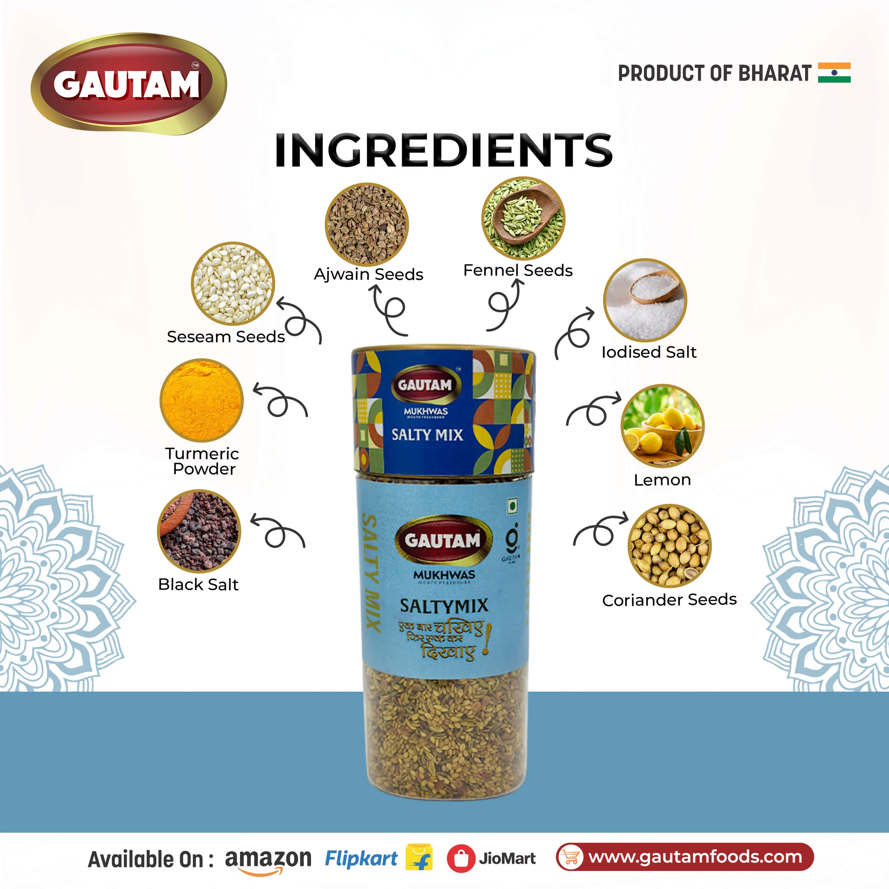 Gautam Salty Mix Mukhwas is a traditional Gujarati-style mouth freshener made with a perfect blend of premium seeds and spices. This classic mix combines sesame seeds, coriander seeds, fennel seeds, and ajwain seeds to deliver an authentic taste along with digestive benefits.